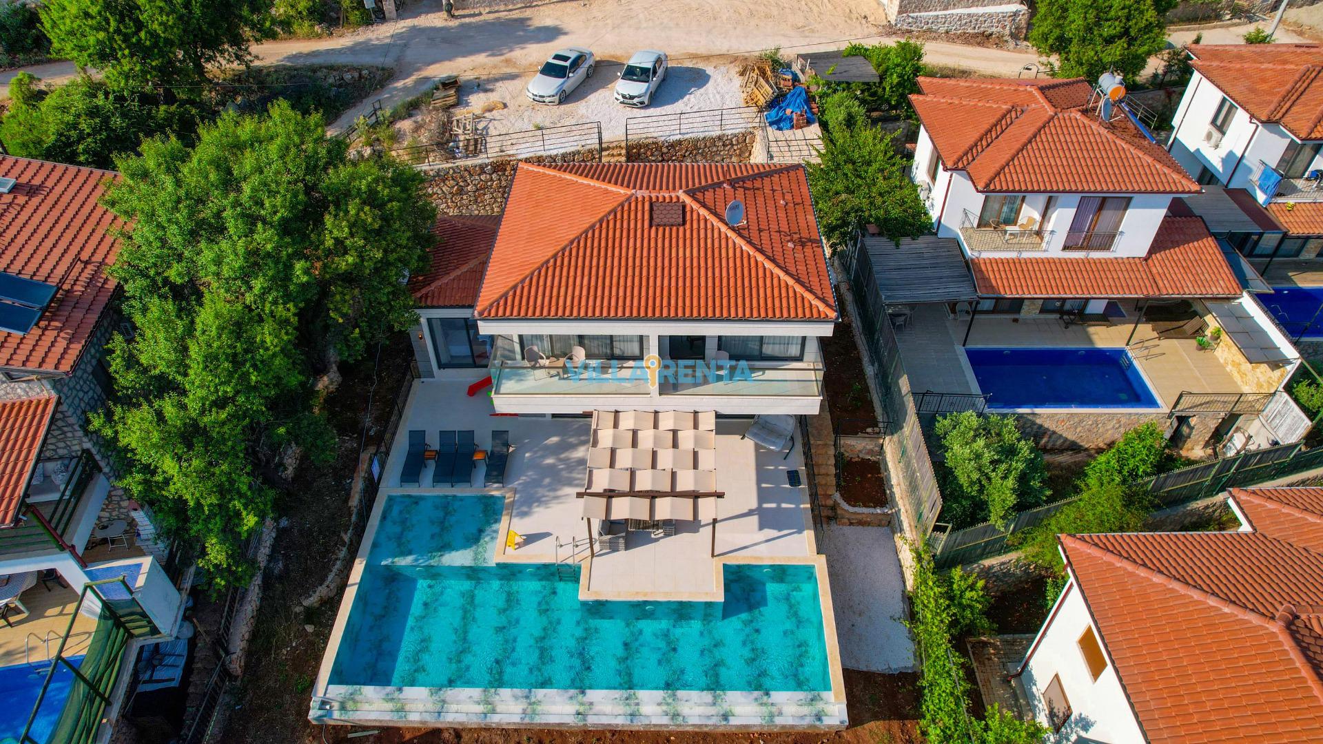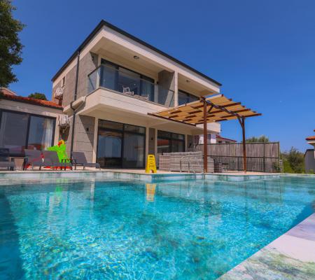 Aileniz İçin Tasarlanmış Havuz Terası: Villamızın geniş havuz terası, tüm yaş gruplarının keyifli vakit geçirebileceği bir sosyal alan olarak kurgulanmıştır. Teras üzerinde çocukların güvenle vakit geçirebileceği bir çocuk oyun parkı ve doğanın sessizliğini dinleyebileceğiniz şık bir salıncak yer almaktadır.