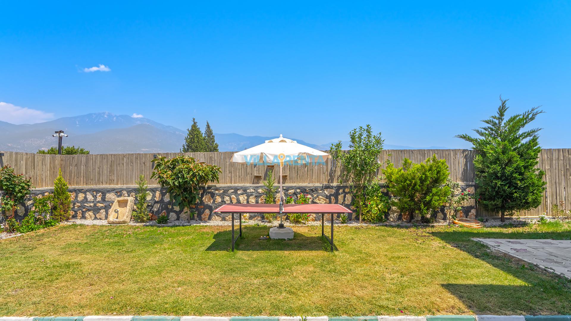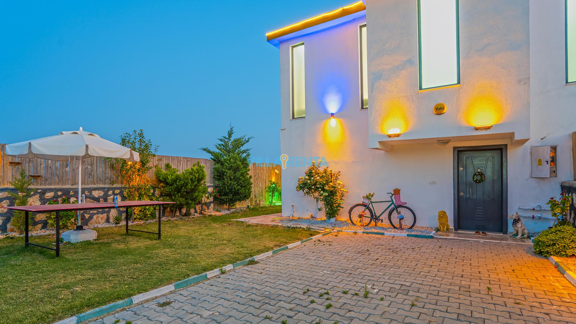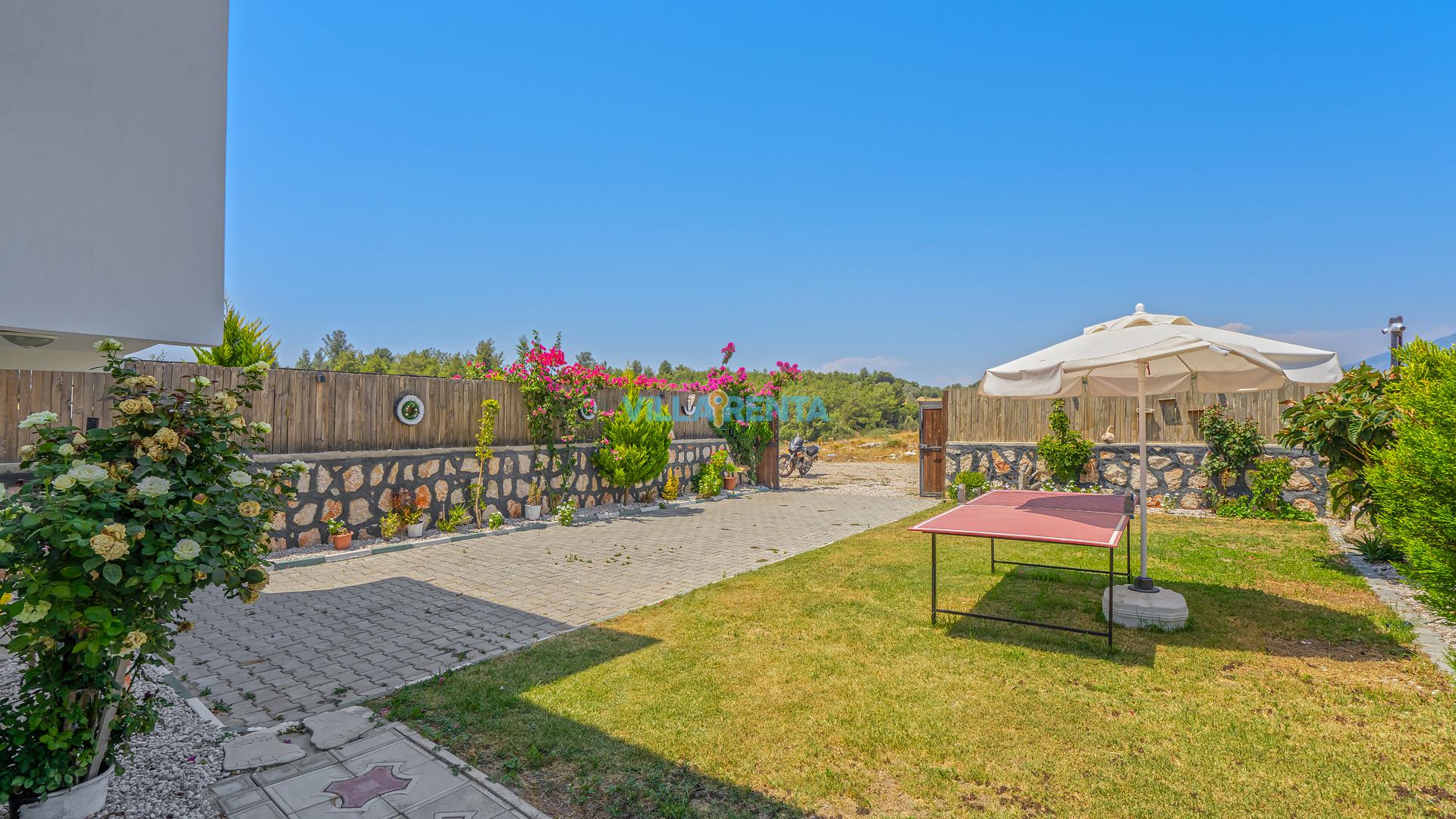 Bahçede Sosyal Yaşam: Villamızın geniş dış mekanı, sadece güneşlenmek için değil, aktif vakit geçirmek için de tasarlandı. Masa tenisi ve geniş barbekü alanı ile akşamlarınız çok daha eğlenceli geçecek.