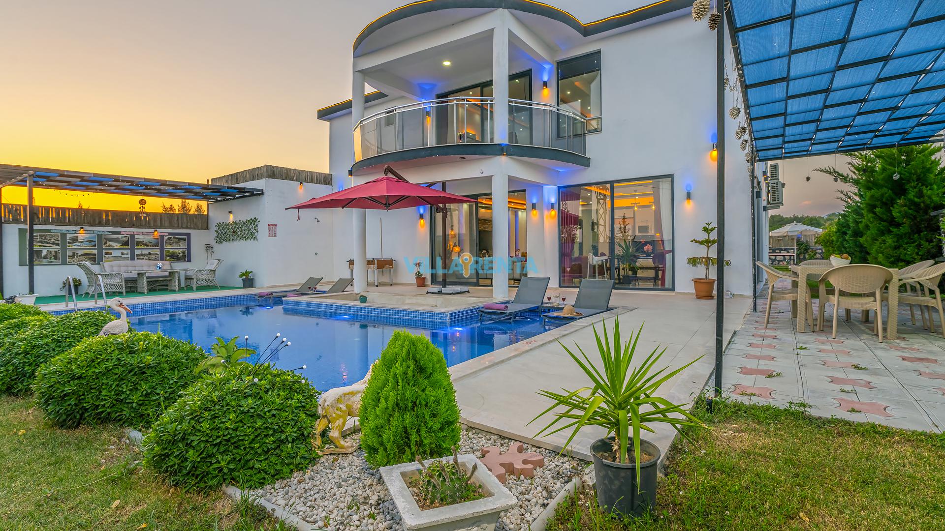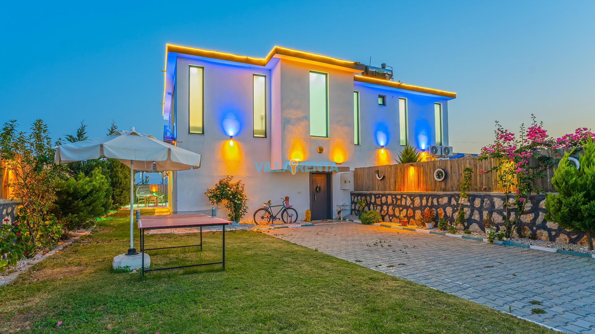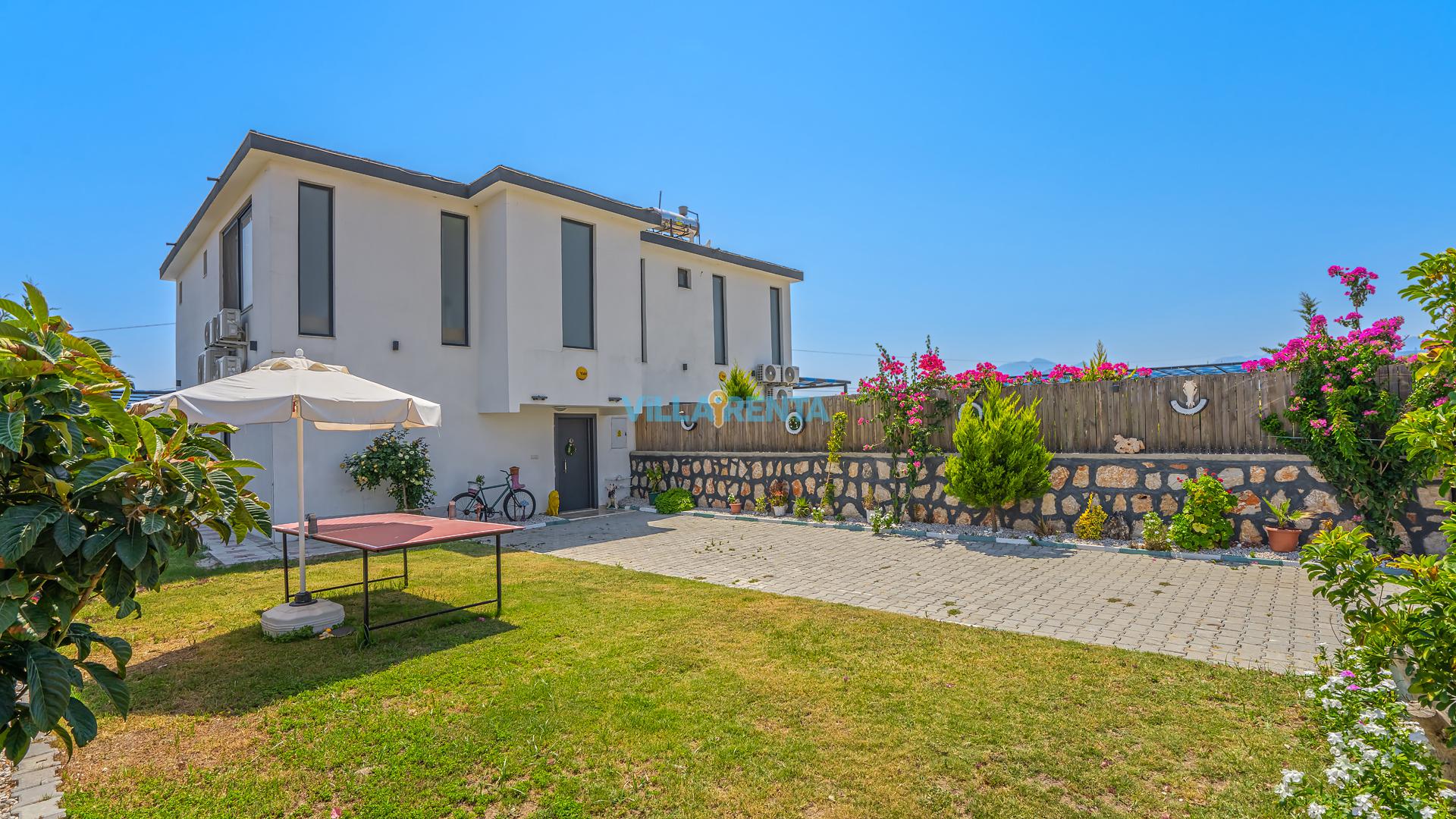 Bahçede Sosyal Yaşam: Villamızın geniş dış mekanı, sadece güneşlenmek için değil, aktif vakit geçirmek için de tasarlandı. Masa tenisi ve geniş barbekü alanı ile akşamlarınız çok daha eğlenceli geçecek.
