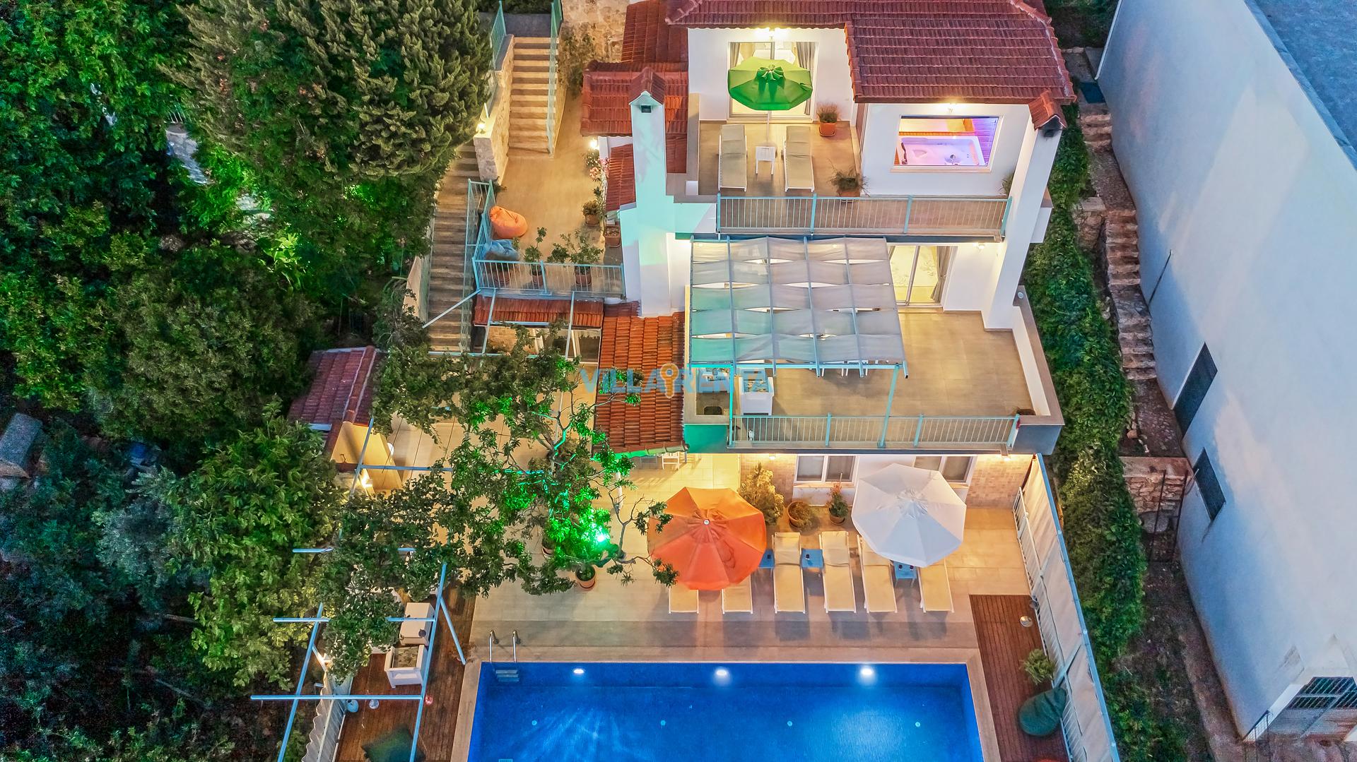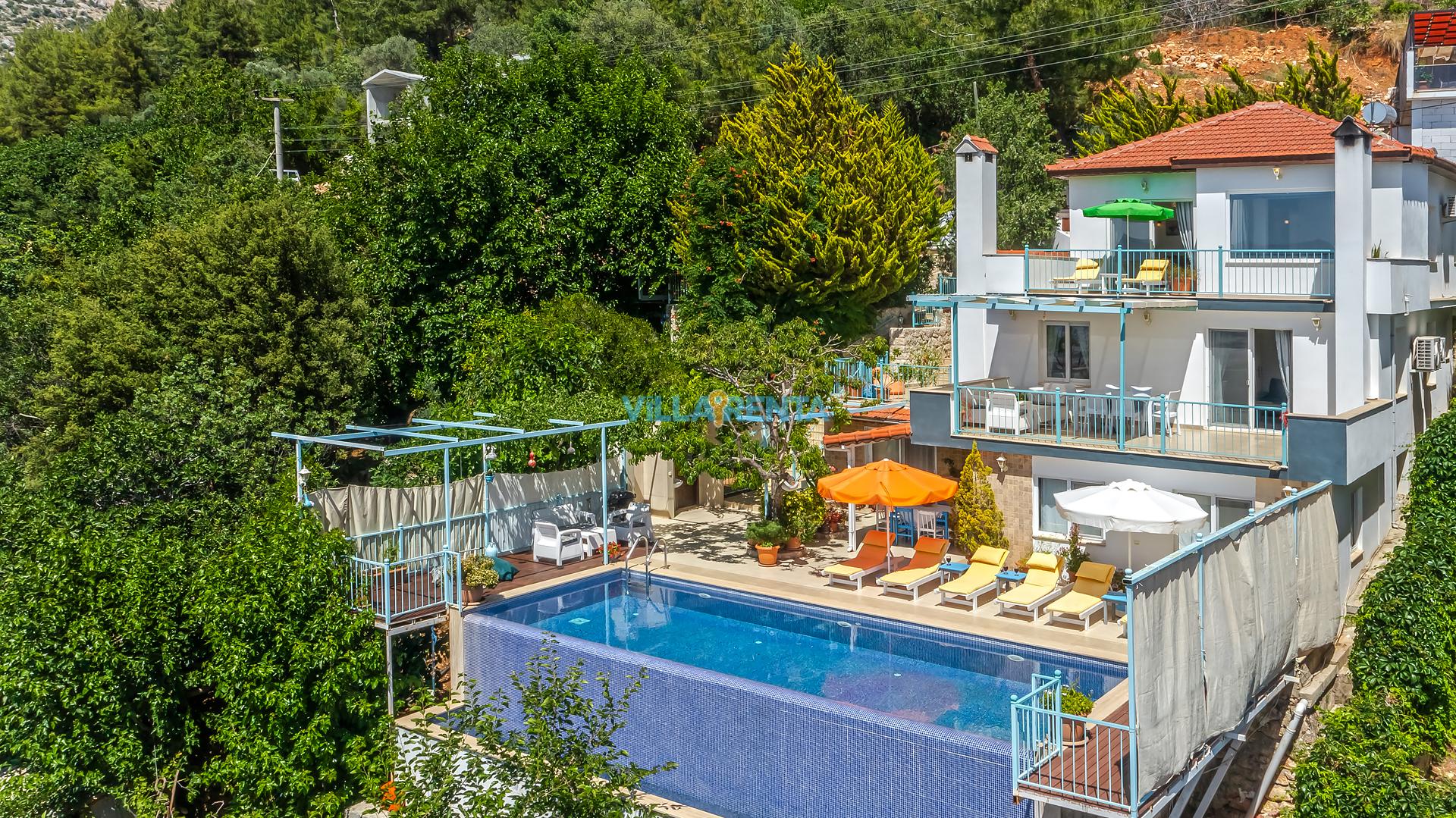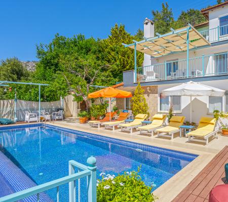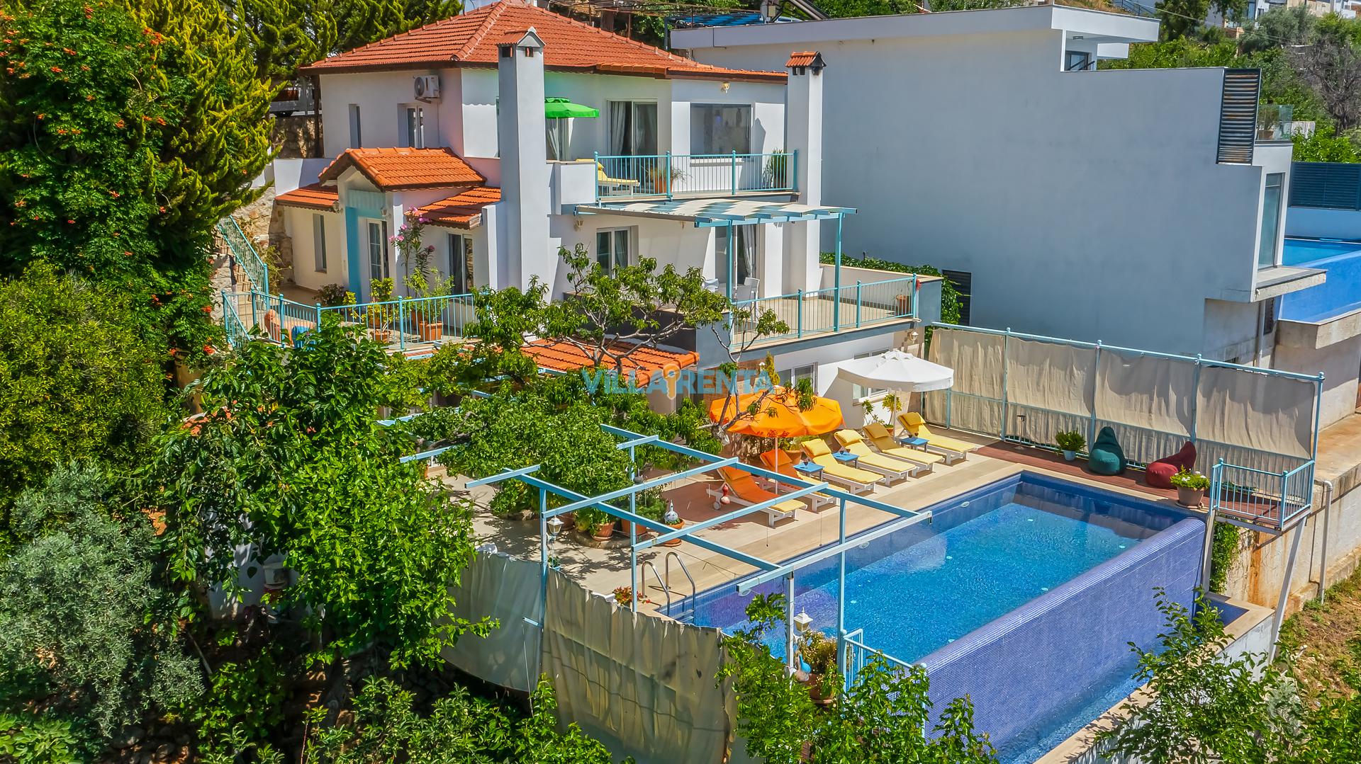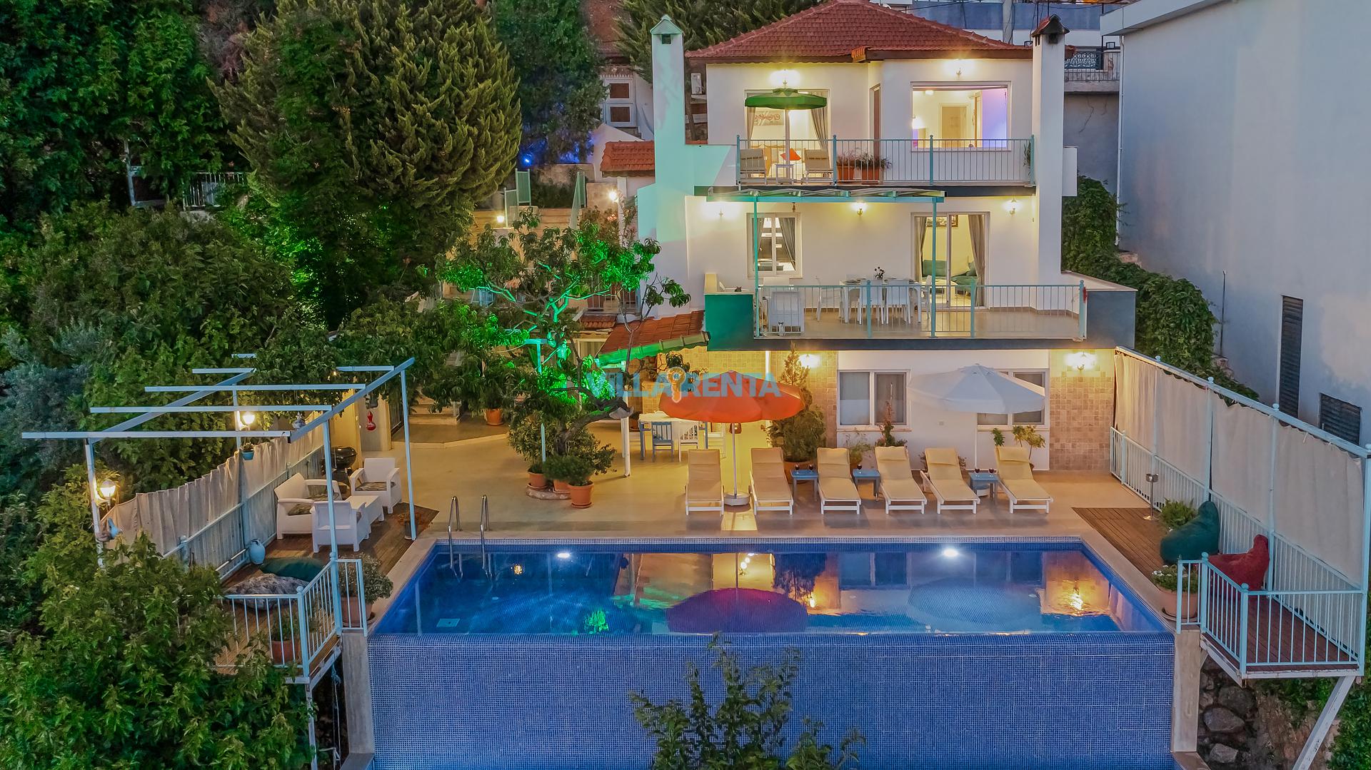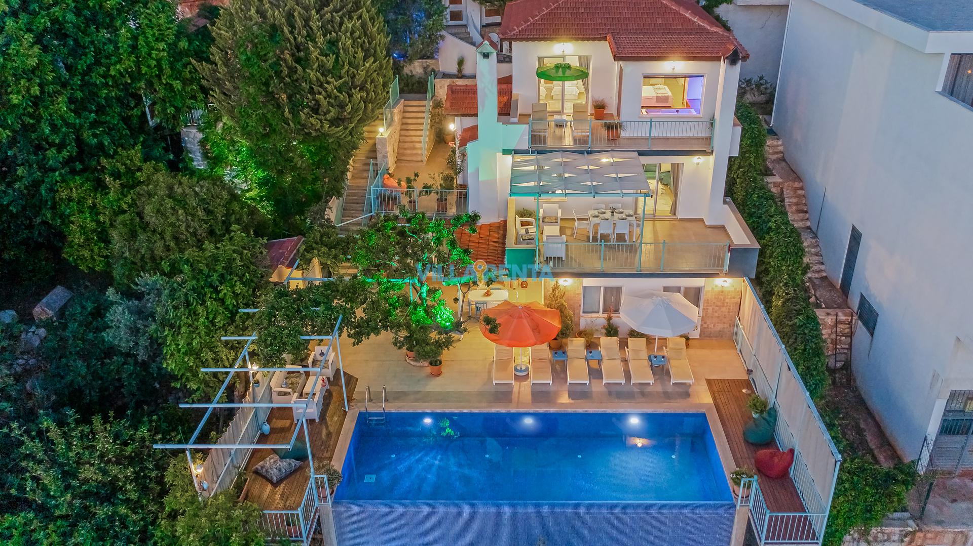 Villa Cennet, Üzümlü bölgesinde konumlanan havuzu tam korunaklı villamızdır. Villamız Kalabalık gruplar ve aileler için ideal bir seçenektir. Villamızın üç katlı bir mimarisi bulunmaktadır. 3 yatak odalı 6 kişilik bir villadır. Tüm odalarında ve salonunda klima bulunmaktadır. İki yatak odasında çift kişilik yatak, ayrıca bu odalarda ebeveyn banyoları da yer almaktadır. Diğer yatak odasında iki adet tek kişilik yatak yer almaktadır. Bu odanın kullandığı banyo ortak alanda yer almaktadır. Ayrıca çift kişilik odanın muhteşem manzaralı bir balkonu ve çift kişilik jakuzisi bulunmaktadır. Çok geniş bir alana kurulan villamız, tek başına doğa içerisinde yer almaktadır. Tatilinizi yemyeşil bir doğa içerisinde ve Kalkan'ın eşsiz manzarası ile birlikte muhteşem bir şekilde geçirebilirsiniz.