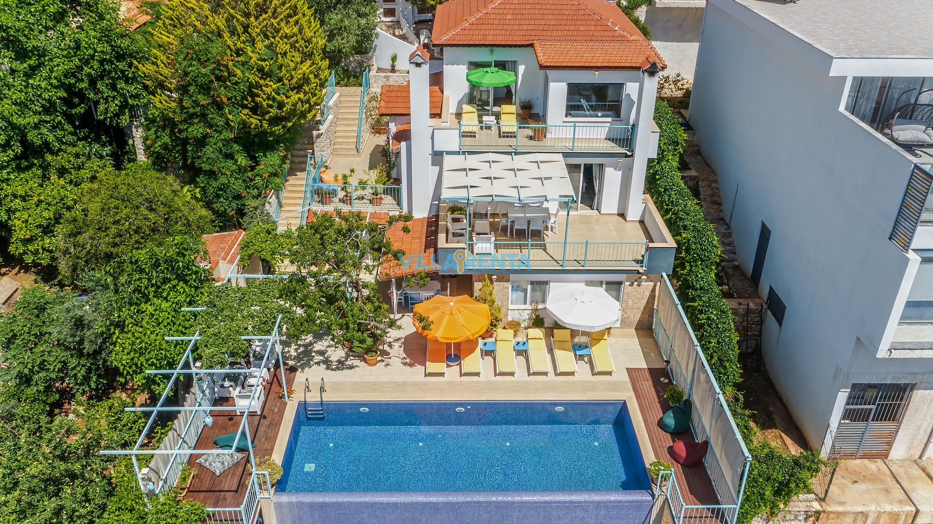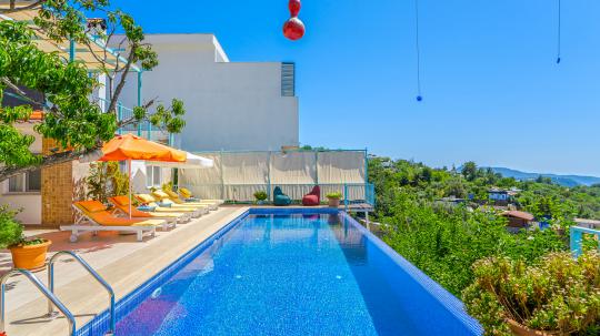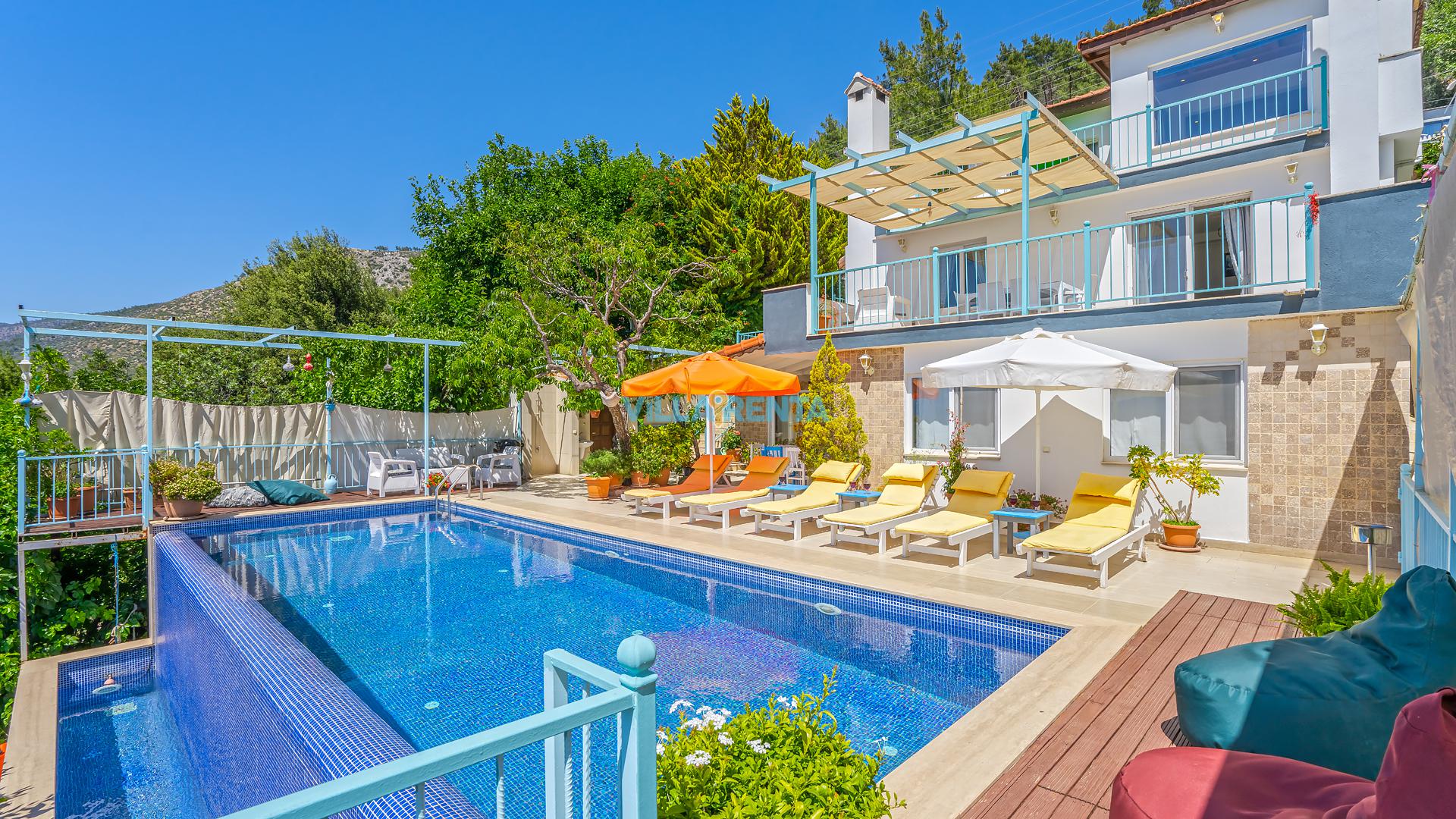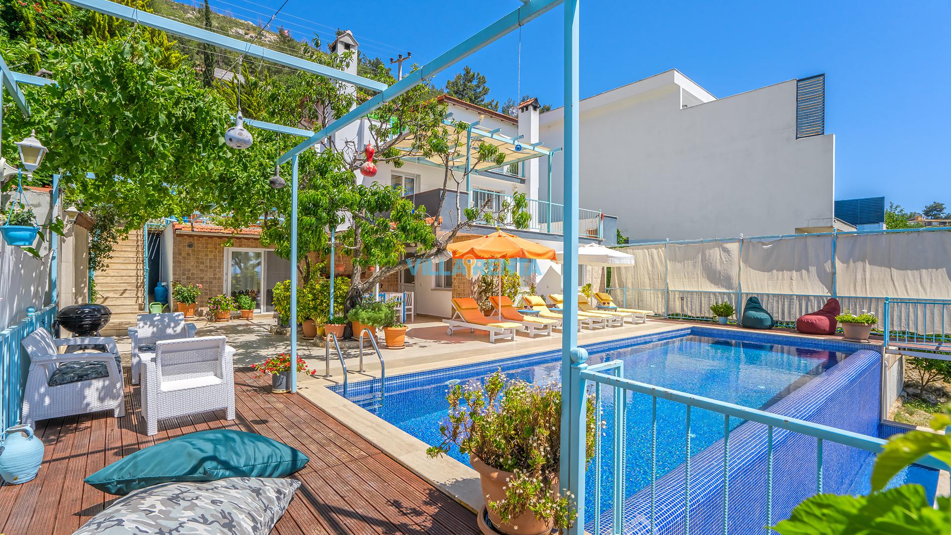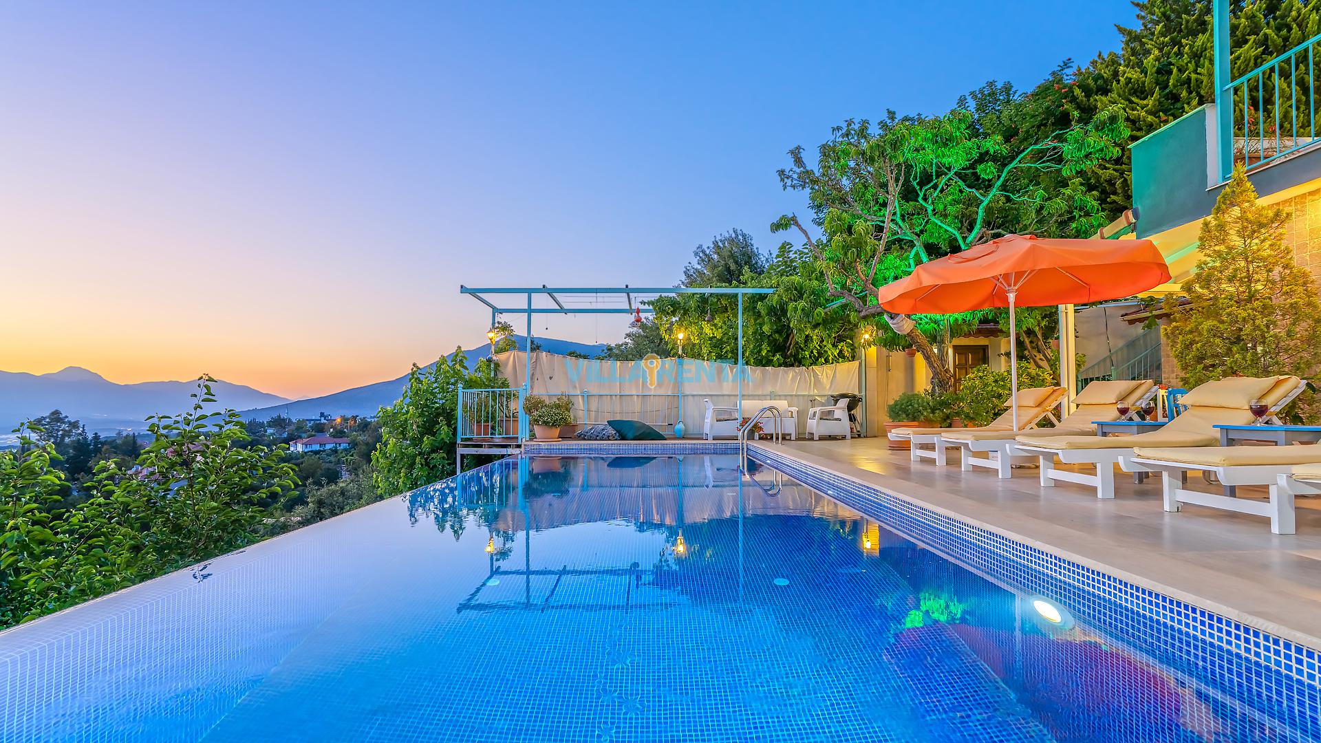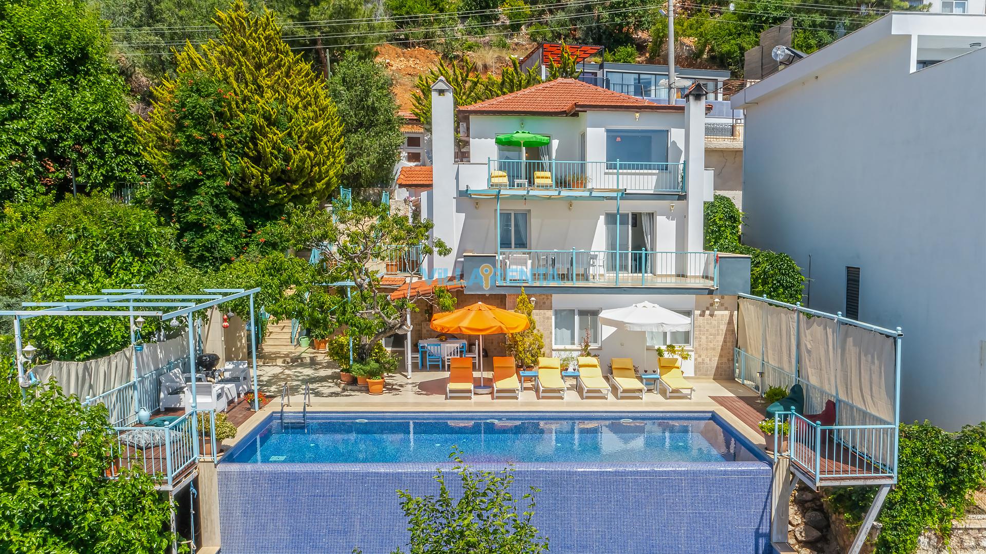 Villa Cennet, Üzümlü bölgesinde konumlanan havuzu tam korunaklı villamızdır. Villamız Kalabalık gruplar ve aileler için ideal bir seçenektir. Villamızın üç katlı bir mimarisi bulunmaktadır. 3 yatak odalı 6 kişilik bir villadır. Tüm odalarında ve salonunda klima bulunmaktadır. İki yatak odasında çift kişilik yatak, ayrıca bu odalarda ebeveyn banyoları da yer almaktadır. Diğer yatak odasında iki adet tek kişilik yatak yer almaktadır. Bu odanın kullandığı banyo ortak alanda yer almaktadır. Ayrıca çift kişilik odanın muhteşem manzaralı bir balkonu ve çift kişilik jakuzisi bulunmaktadır. Çok geniş bir alana kurulan villamız, tek başına doğa içerisinde yer almaktadır. Tatilinizi yemyeşil bir doğa içerisinde ve Kalkan'ın eşsiz manzarası ile birlikte muhteşem bir şekilde geçirebilirsiniz.