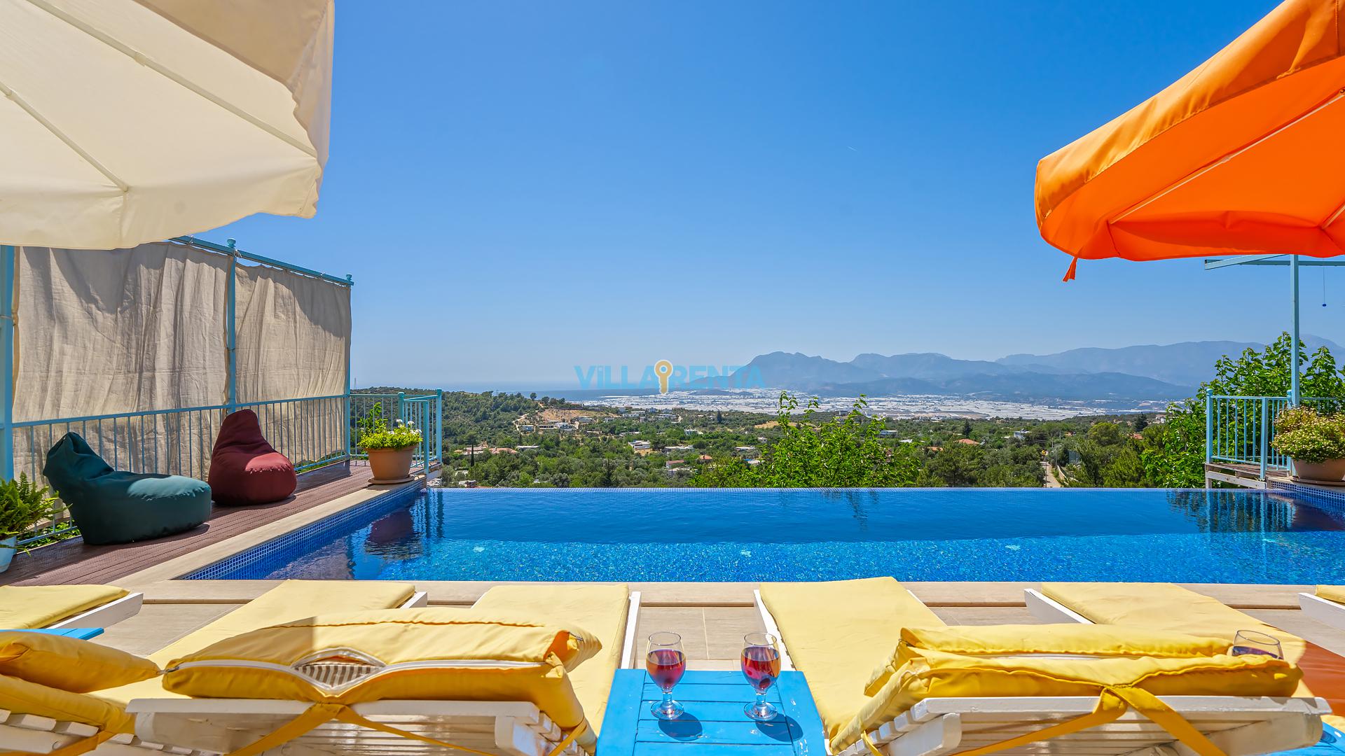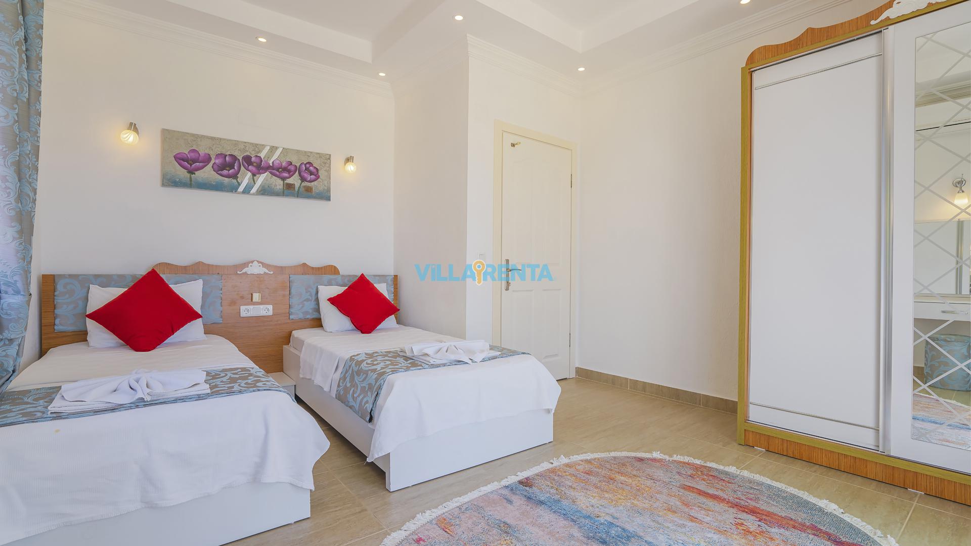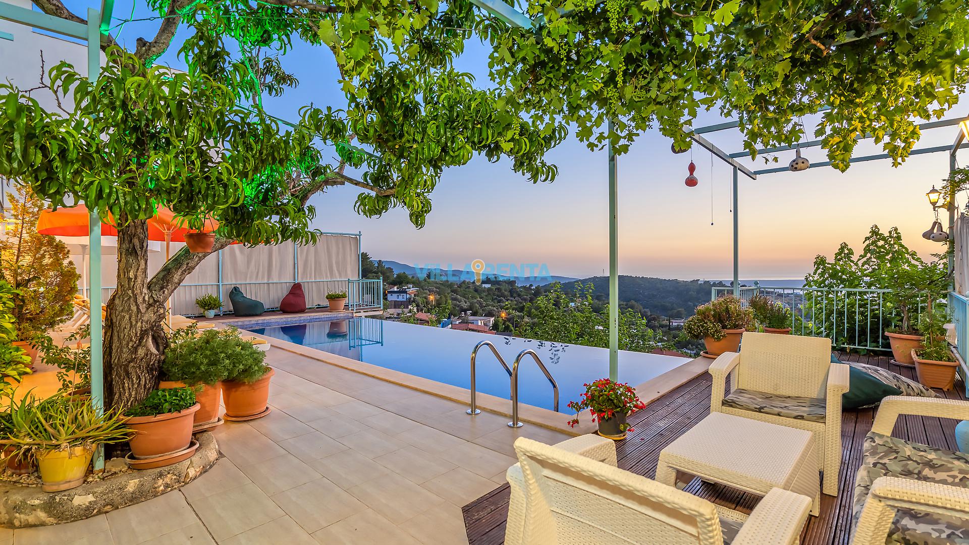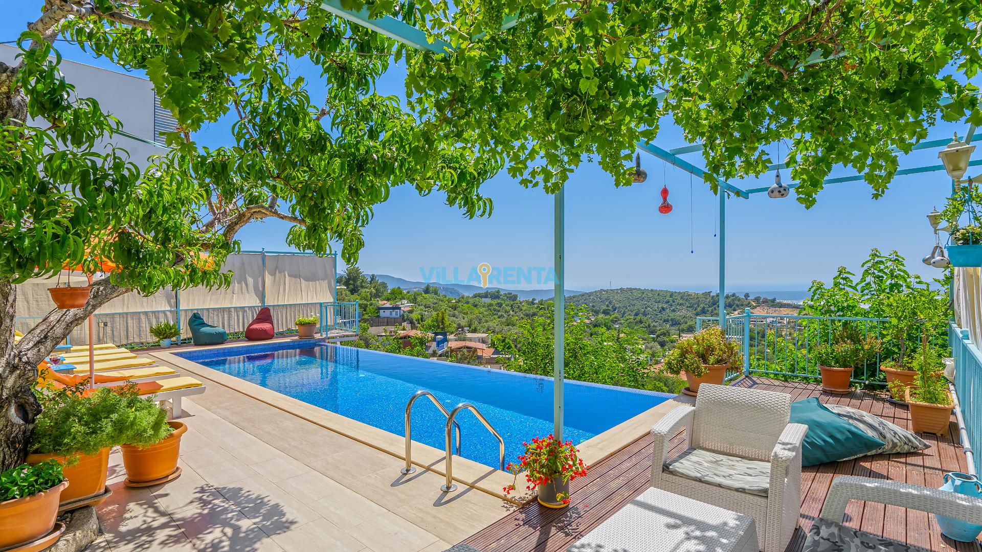 Villa Cennet, Üzümlü bölgesinde konumlanan havuzu tam korunaklı villamızdır. Villamız Kalabalık gruplar ve aileler için ideal bir seçenektir. Villamızın üç katlı bir mimarisi bulunmaktadır. 3 yatak odalı 6 kişilik bir villadır. Tüm odalarında ve salonunda klima bulunmaktadır. İki yatak odasında çift kişilik yatak, ayrıca bu odalarda ebeveyn banyoları da yer almaktadır. Diğer yatak odasında iki adet tek kişilik yatak yer almaktadır. Bu odanın kullandığı banyo ortak alanda yer almaktadır. Ayrıca çift kişilik odanın muhteşem manzaralı bir balkonu ve çift kişilik jakuzisi bulunmaktadır. Çok geniş bir alana kurulan villamız, tek başına doğa içerisinde yer almaktadır. Tatilinizi yemyeşil bir doğa içerisinde ve Kalkan'ın eşsiz manzarası ile birlikte muhteşem bir şekilde geçirebilirsiniz.