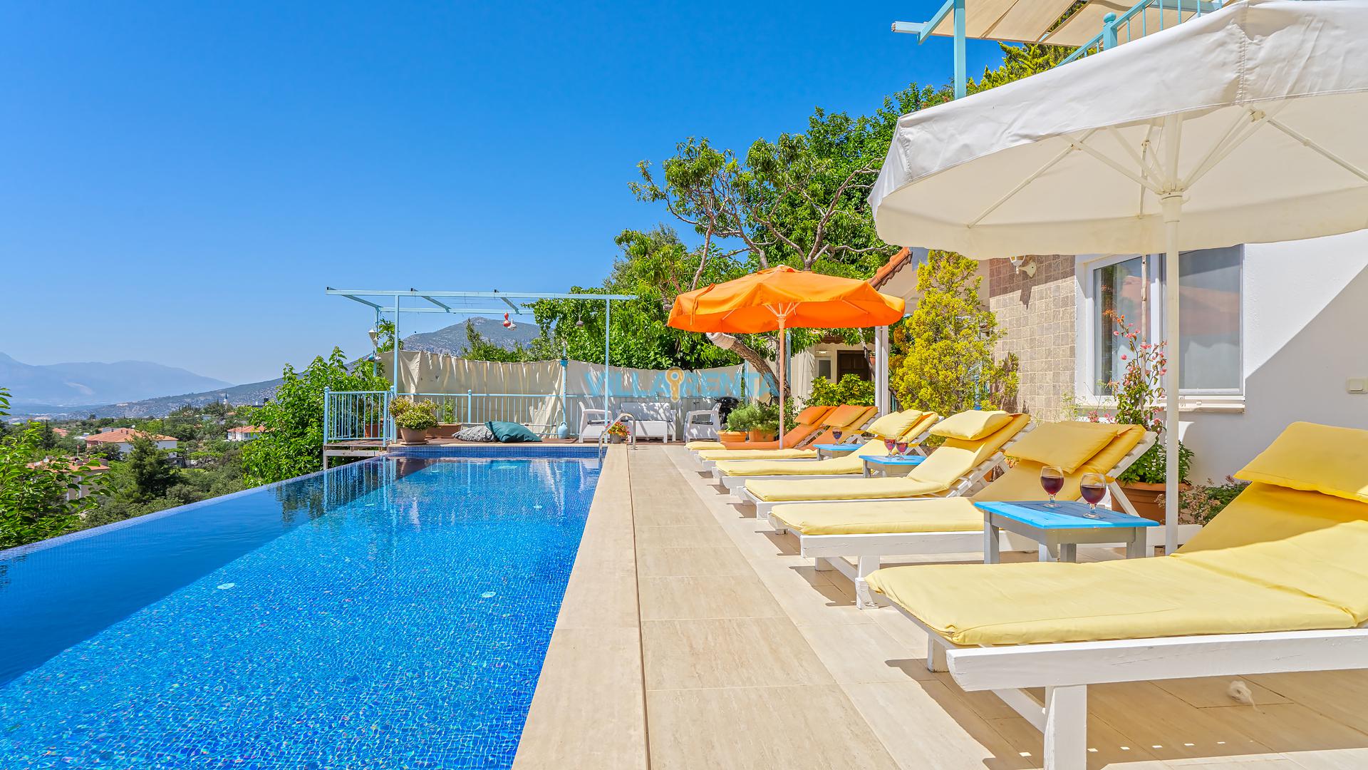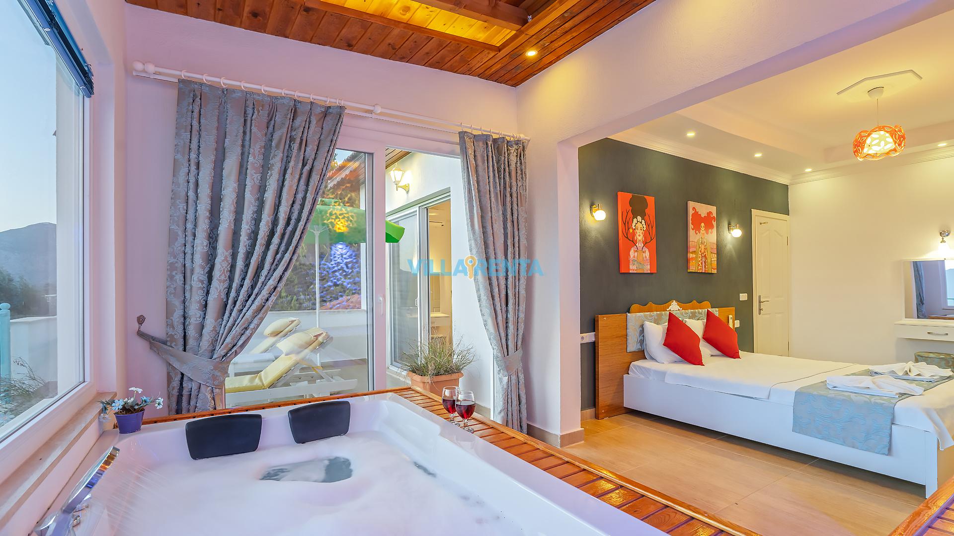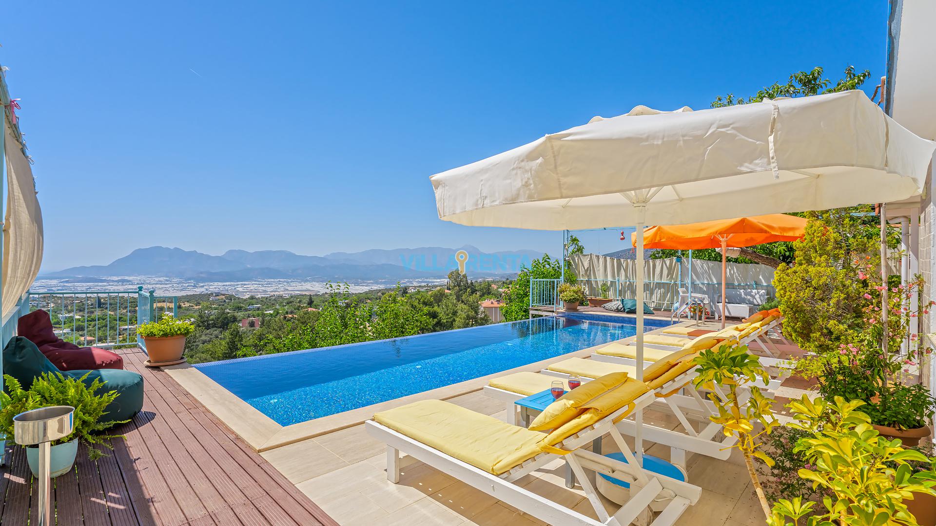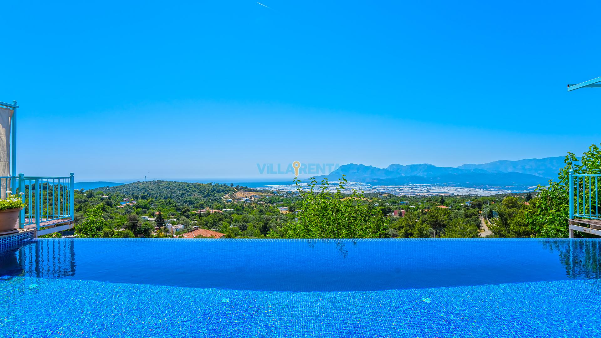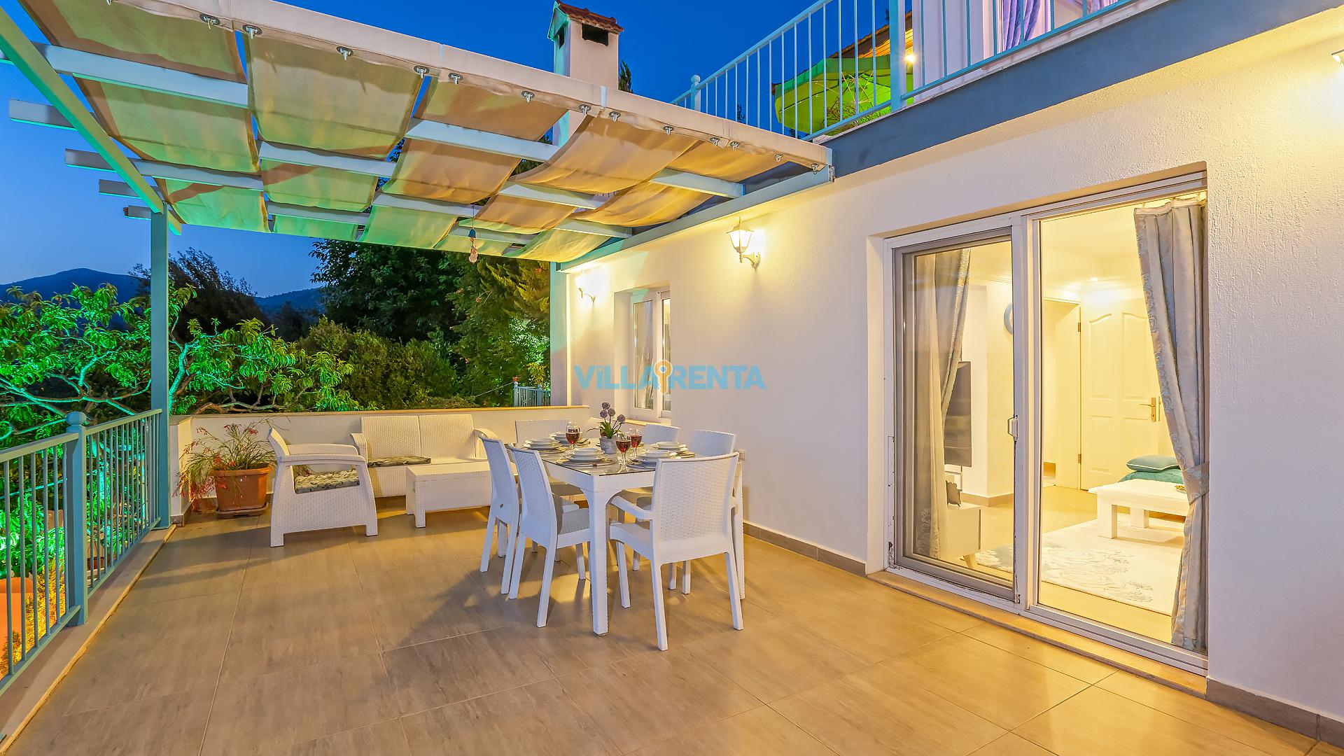 Villa Cennet, Üzümlü bölgesinde konumlanan havuzu tam korunaklı villamızdır. Villamız Kalabalık gruplar ve aileler için ideal bir seçenektir. Villamızın üç katlı bir mimarisi bulunmaktadır. 3 yatak odalı 6 kişilik bir villadır. Tüm odalarında ve salonunda klima bulunmaktadır. İki yatak odasında çift kişilik yatak, ayrıca bu odalarda ebeveyn banyoları da yer almaktadır. Diğer yatak odasında iki adet tek kişilik yatak yer almaktadır. Bu odanın kullandığı banyo ortak alanda yer almaktadır. Ayrıca çift kişilik odanın muhteşem manzaralı bir balkonu ve çift kişilik jakuzisi bulunmaktadır. Çok geniş bir alana kurulan villamız, tek başına doğa içerisinde yer almaktadır. Tatilinizi yemyeşil bir doğa içerisinde ve Kalkan'ın eşsiz manzarası ile birlikte muhteşem bir şekilde geçirebilirsiniz.