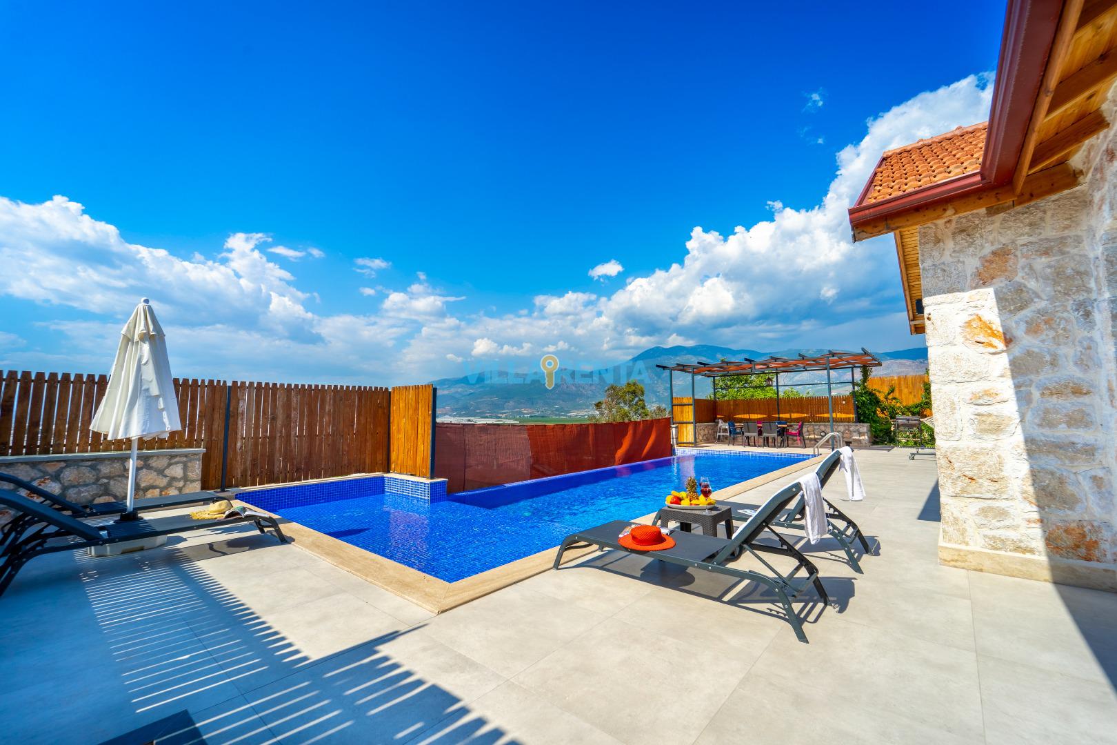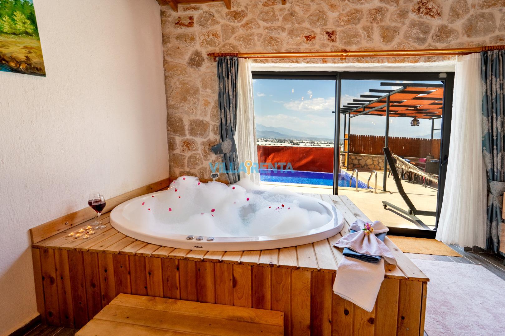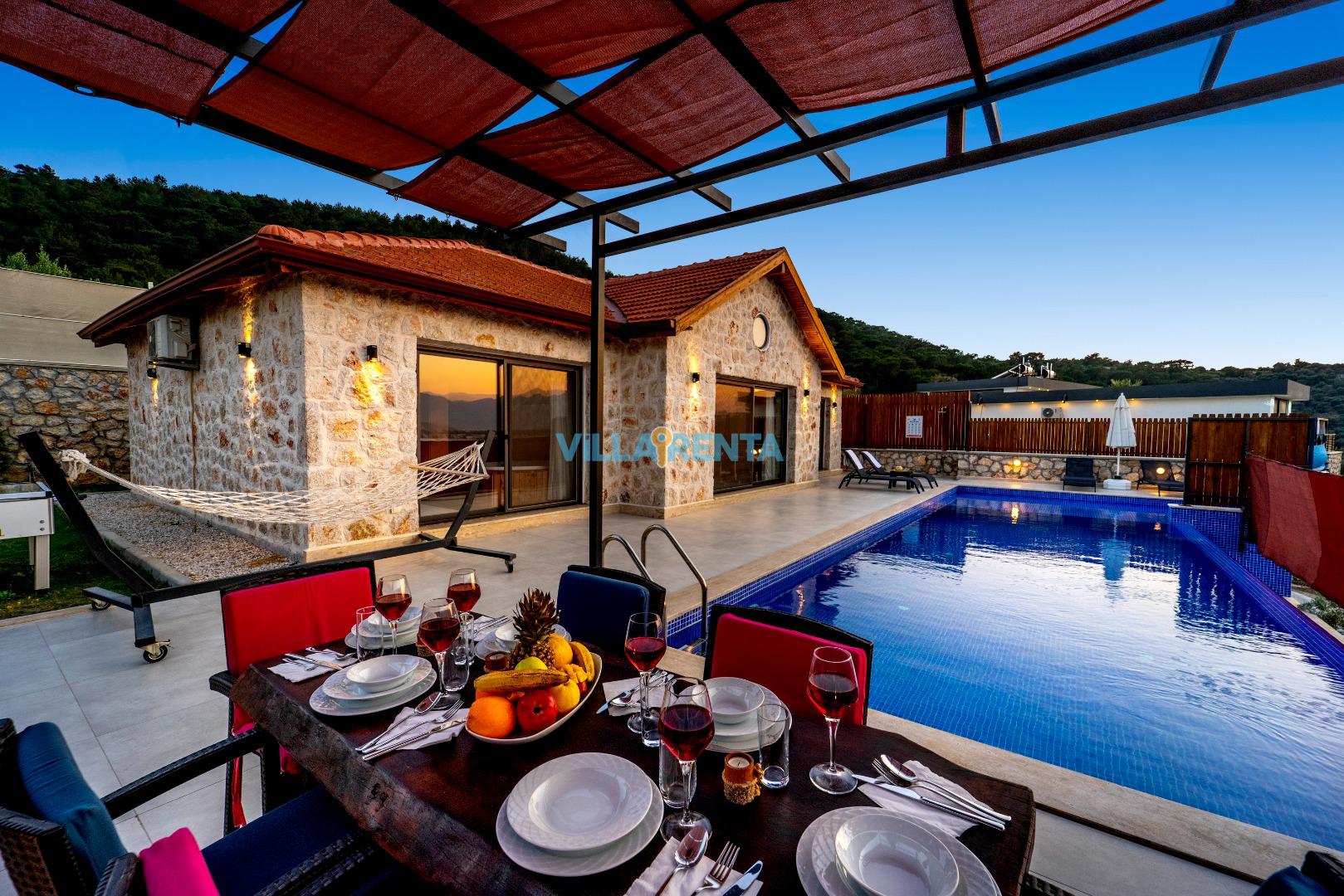 Villa Gemicik, Kalkan Patara bölgesinde bulunan doğa manzaralı tatil villamızdır. Taş mimarisi ve keyifli dekorasyonu ile öne çıkan villamızda jakuzi, masa tenisi, langırt gibi çiftlerimizin tatil keyfini tamamlayıcı detaylar da bulunmaktadır. Villamızın havuz terası korunaklı olup gözlerden uzak huzurlu bir tatil geçirmek isteyen çiftlerimiz için son derece uygundur.