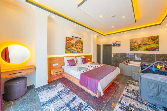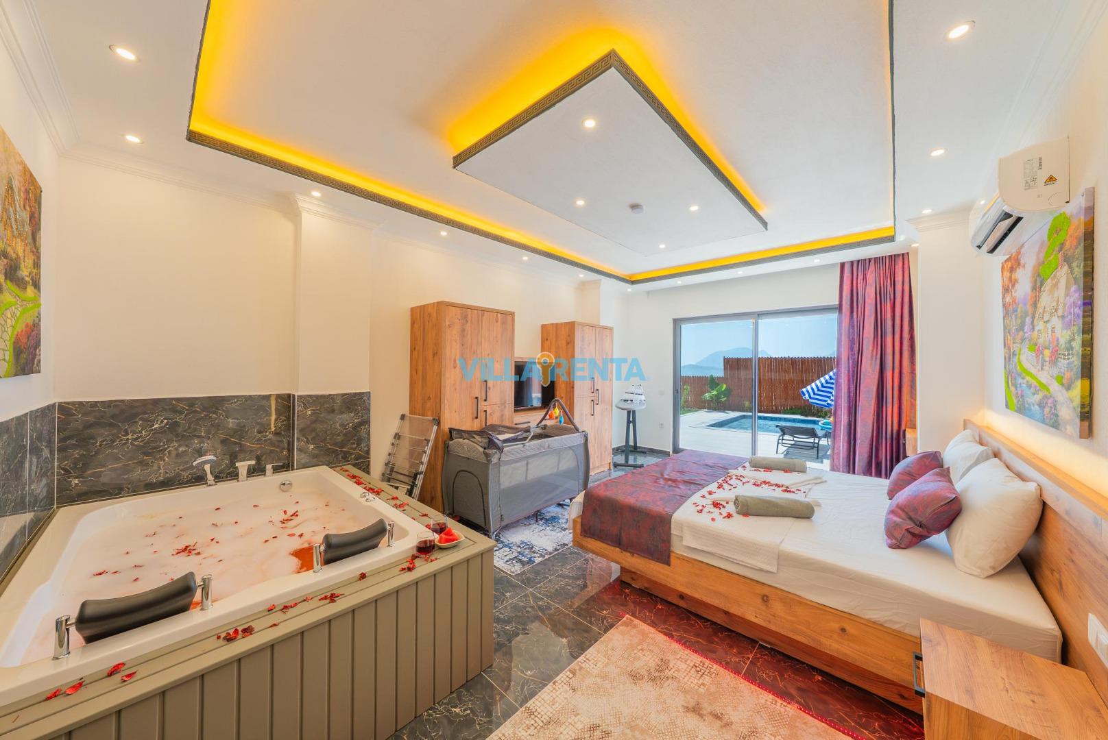 Özel Spa Deneyimi: Ebeveyn yatak odasında yer alan şık ve konforlu jakuzi, doğa manzarasının sakinliği eşliğinde yılın yorgunluğunu atmanız için ideal bir köşe sunar.