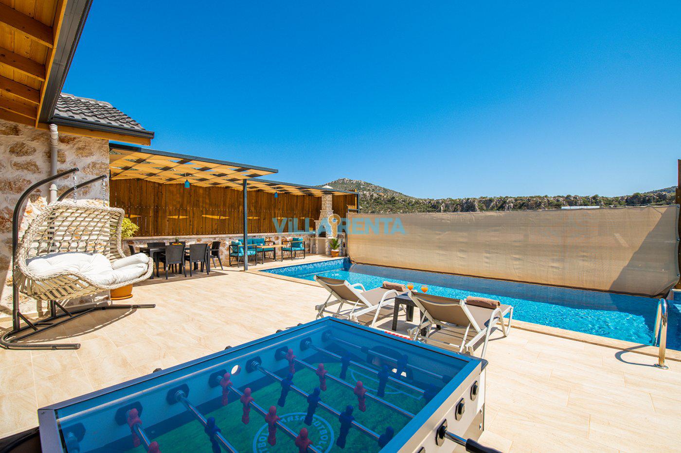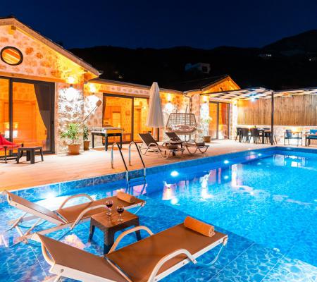 Villa Nefesim, Kalkan Ulugöl’de yer alan korunaklı kiralık villalarımız arasında yer almaktadır. Villamız 2 yatak odalı 4 kişilik bir villadır. Villamız taş yapıda olup özenle dekore edilmiştir. Villamızın yatak odasında bulunan 2 kişilik jakuzisinde tüm yılın yorgunluğunu atıp keyifli bir tatil geçirebilirsiniz. Aynı zamanda villamızın havuz terasında salıncağı ve langırtı vardır.