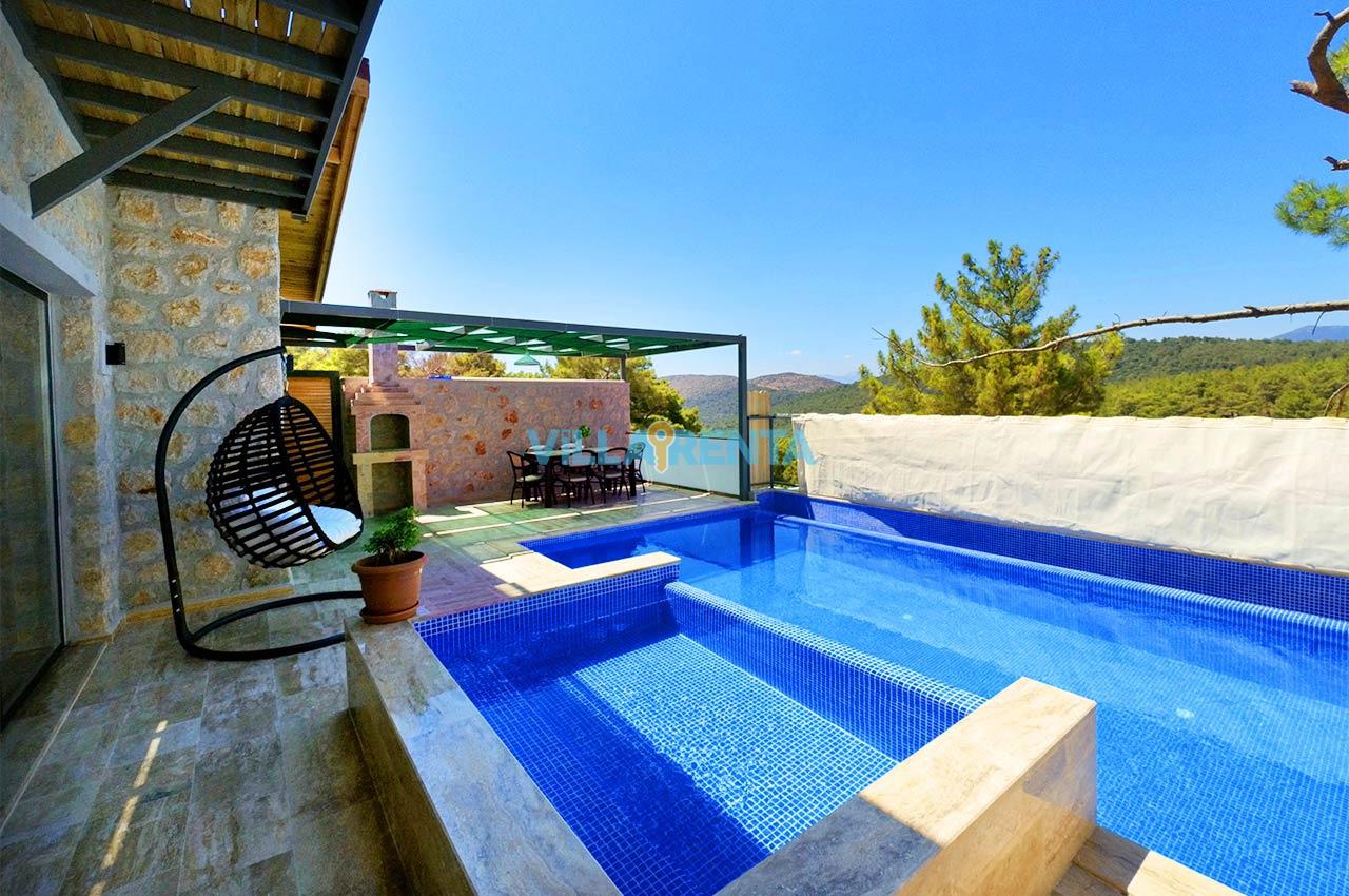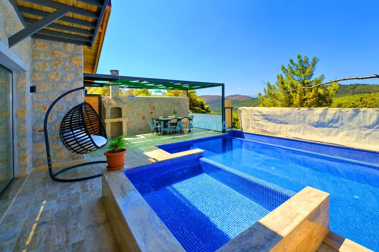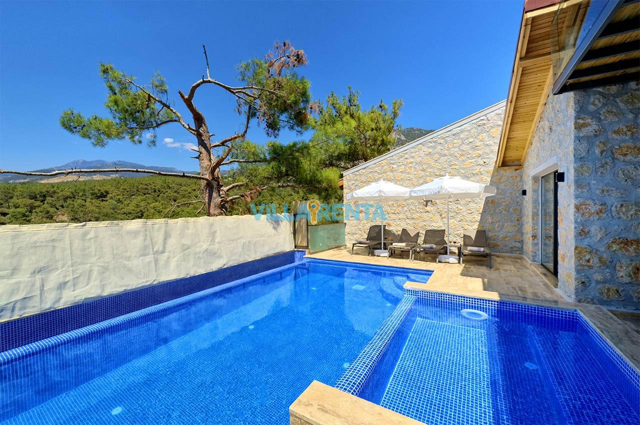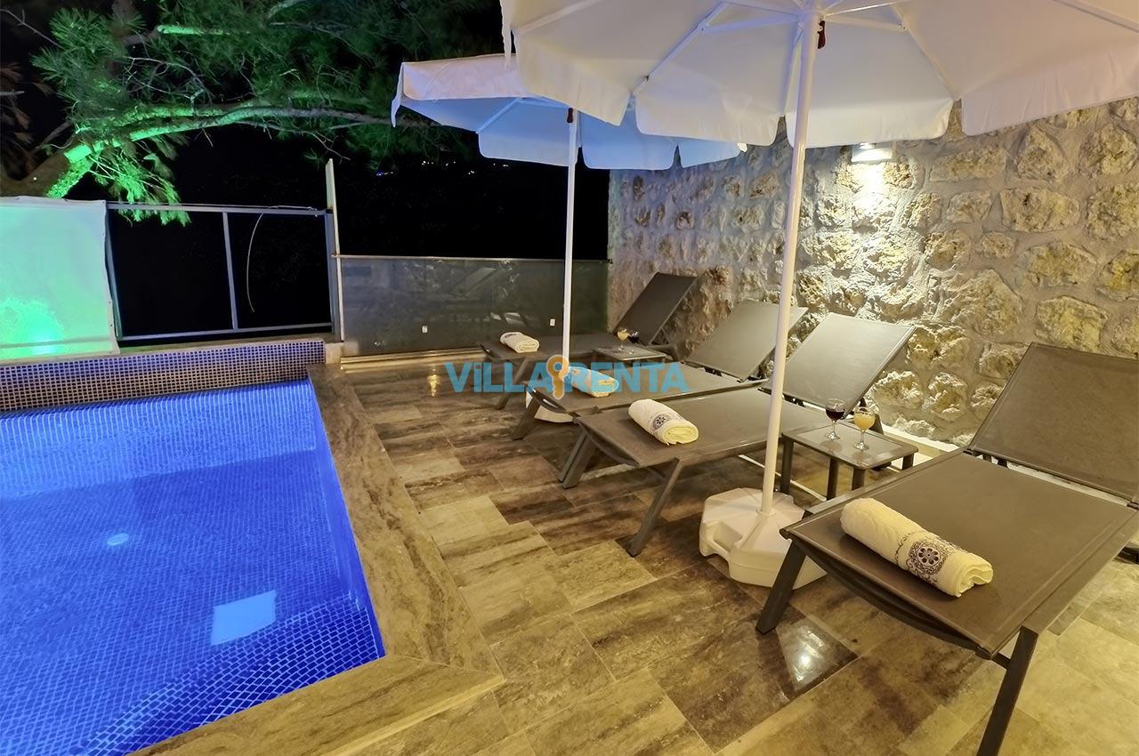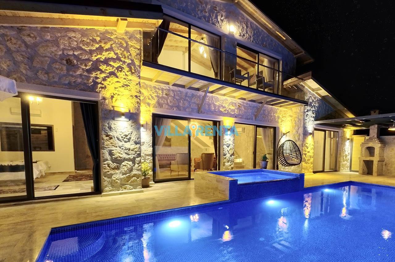 Villa Zeyno Serenity, Kalkan Akbel bölgesinde bulunan merkeze yakın kiralık tatil villamızdır. Villamız taş mimariye sahip olup keyifli bir tatil imkanı sunmaktadır. Ana yatak odasında jakuzisi bulunan villamız merkeze 5-6 dakika mesafededir. Villamızın havuz terası korunaklı olup dışardan görünmemektedir.