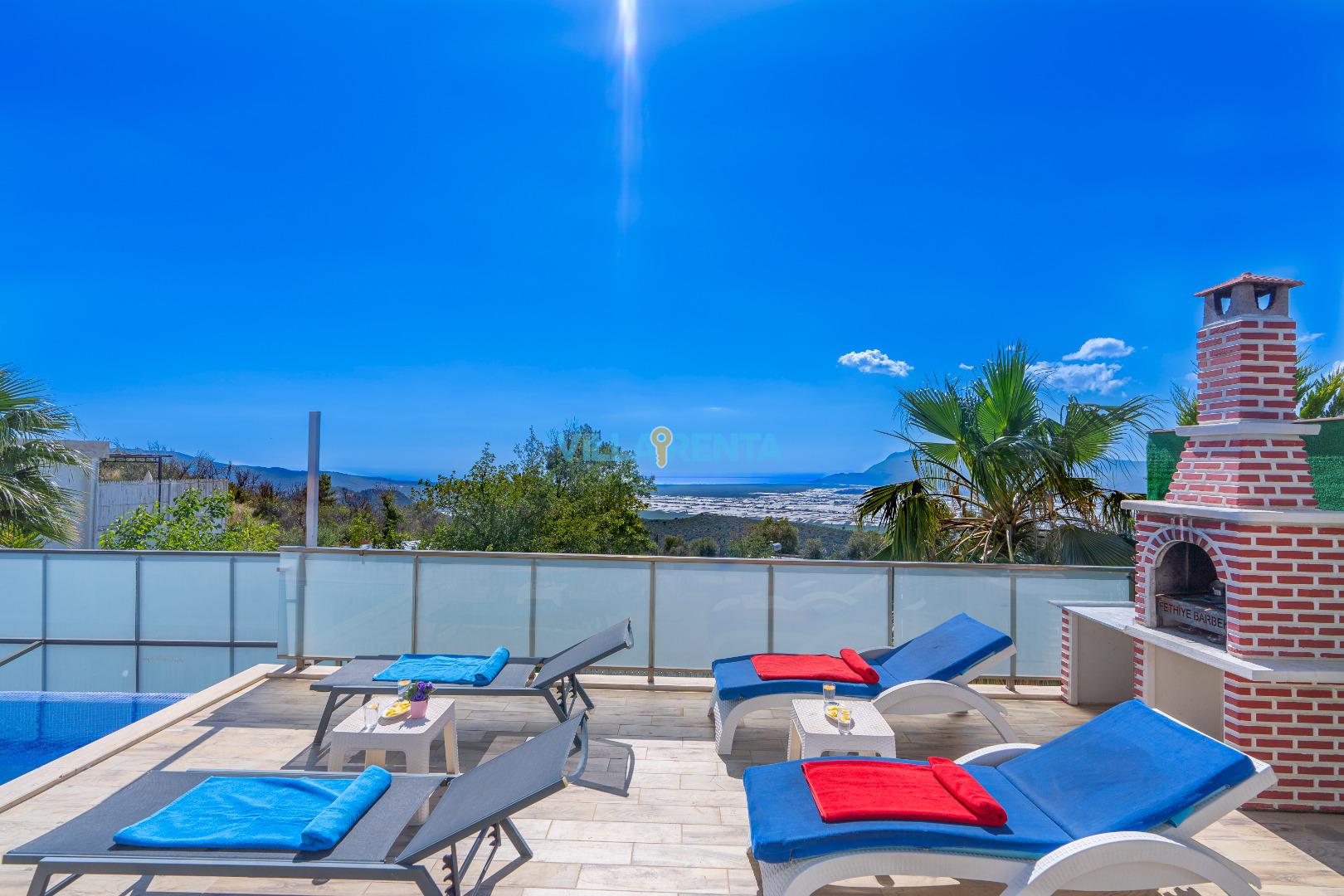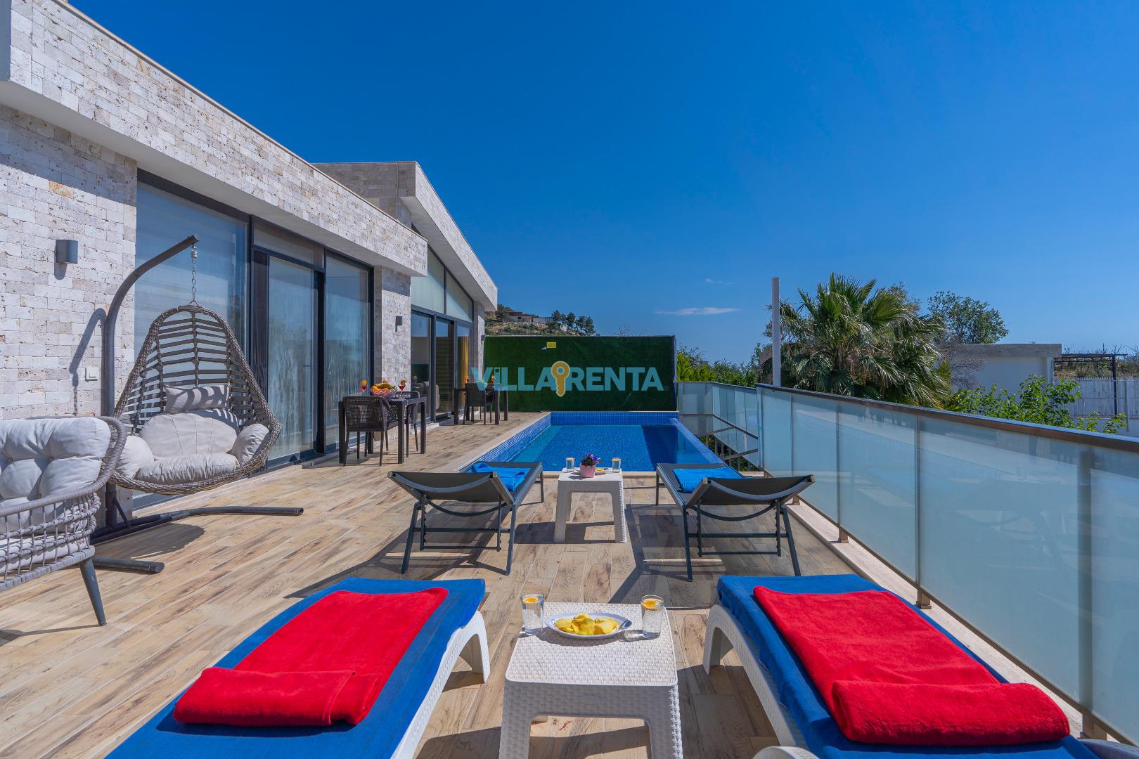 Manzaralı Teras: Havuz terasındaki konforlu oturma grubu ve salıncak, Üzümlü’nün meşhur gün batımını izlemek için en ideal yer.